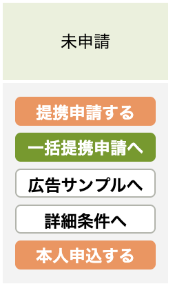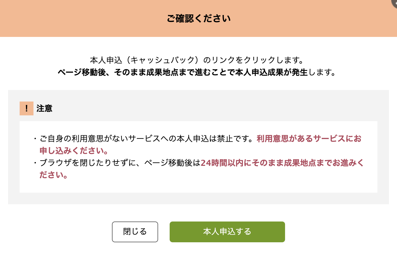 たとえば、もしもアフィリエイトでは、紹介案件の右側に「本人申込」というリンクが表示されており、そこから進むだけでキャッシュバックが発生します。