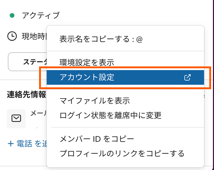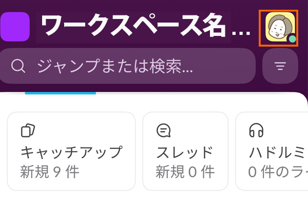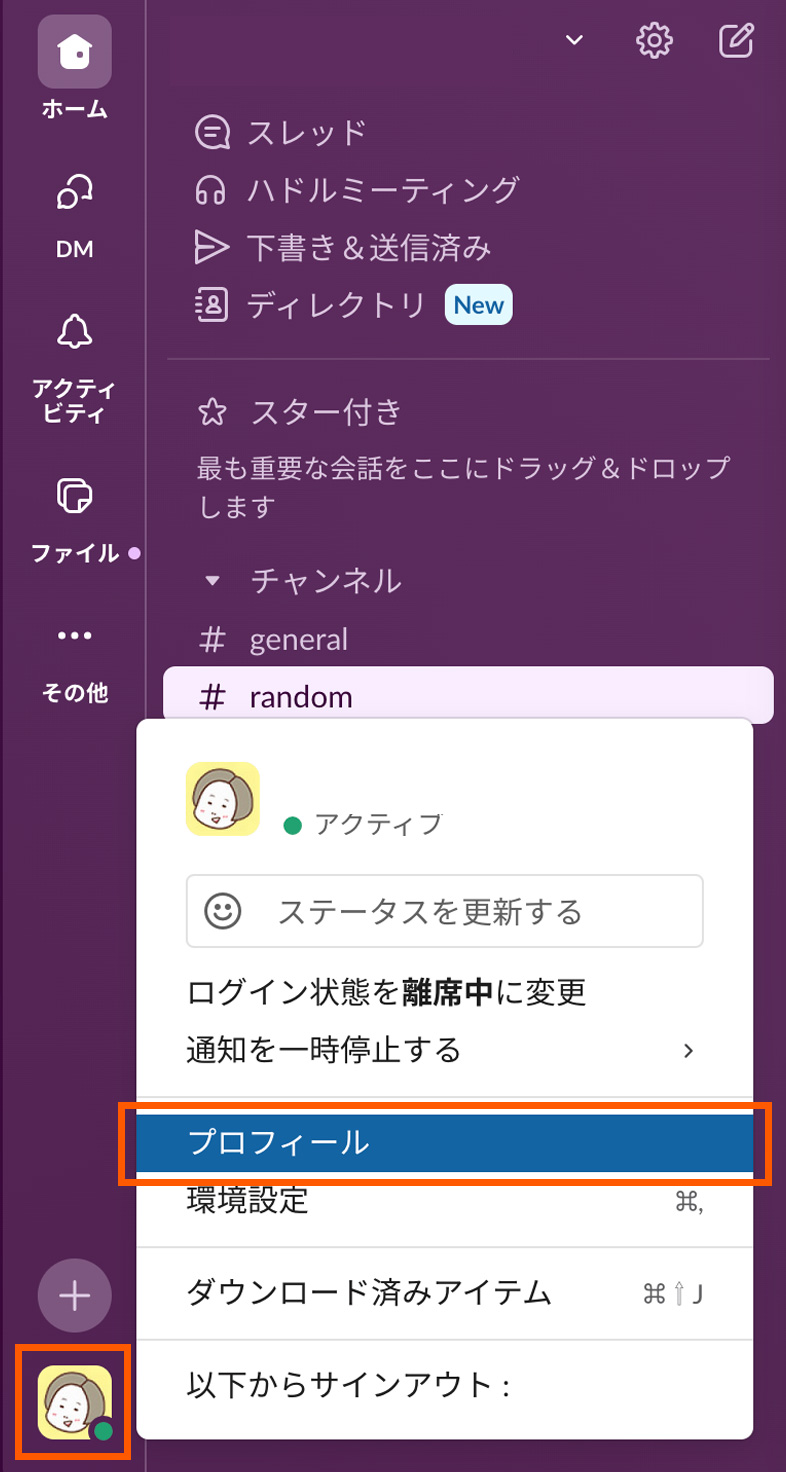 ワークスペース内の左メニュー、一番下の自分のアイコンをクリックし「プロフィール」を選択。