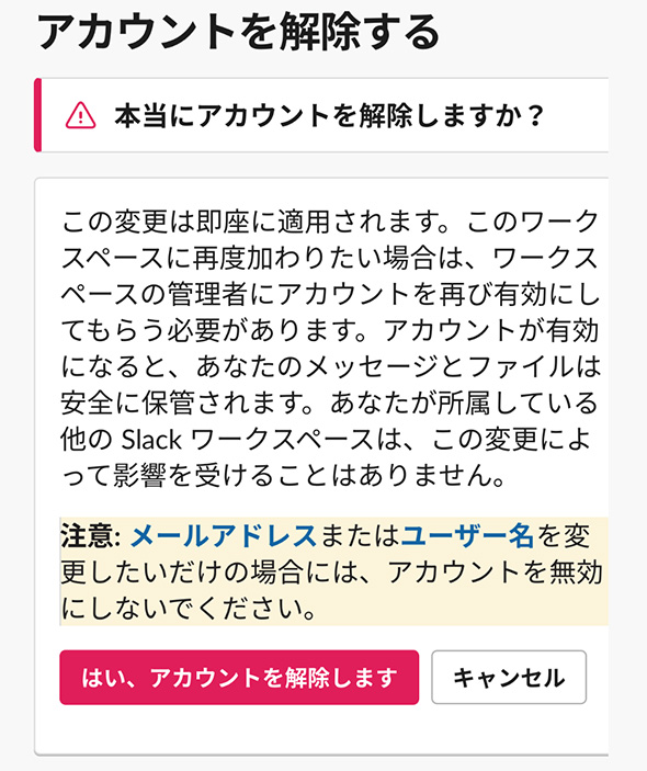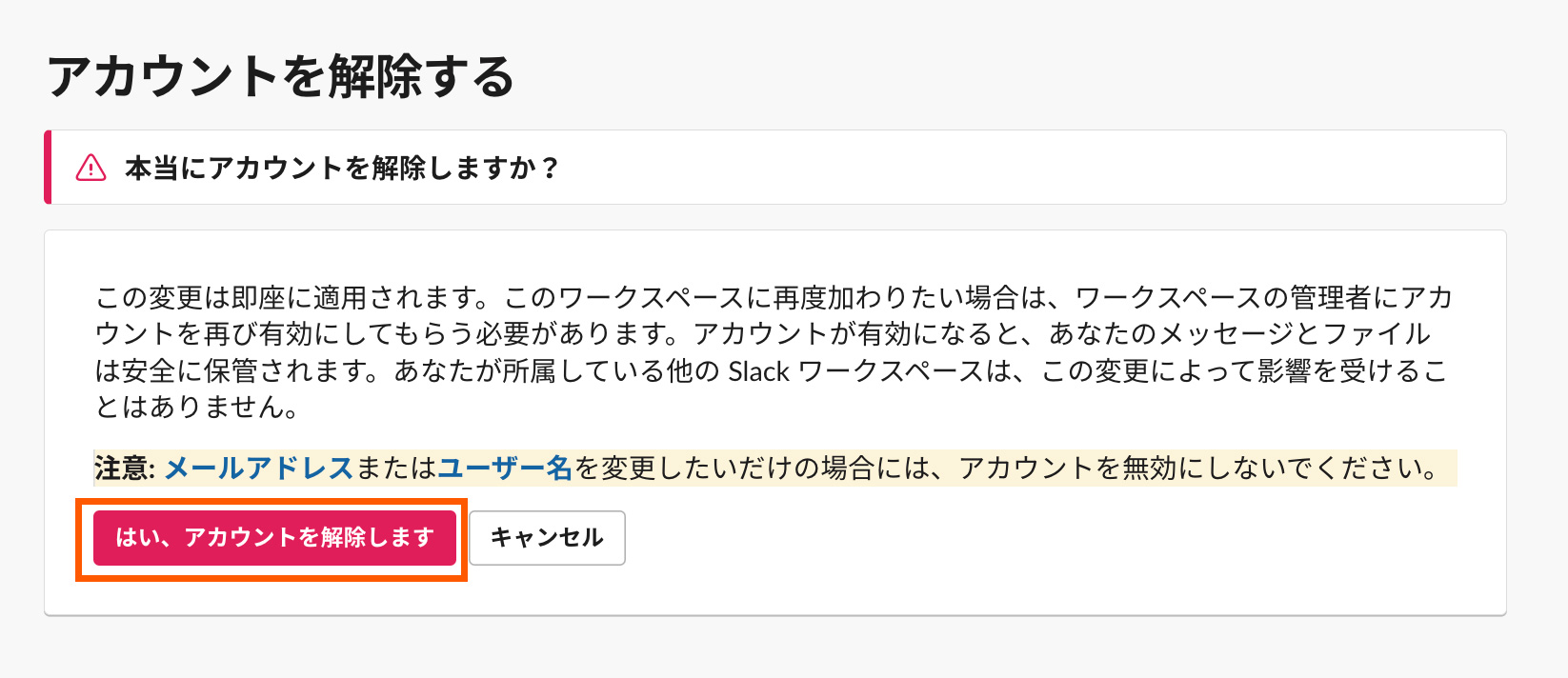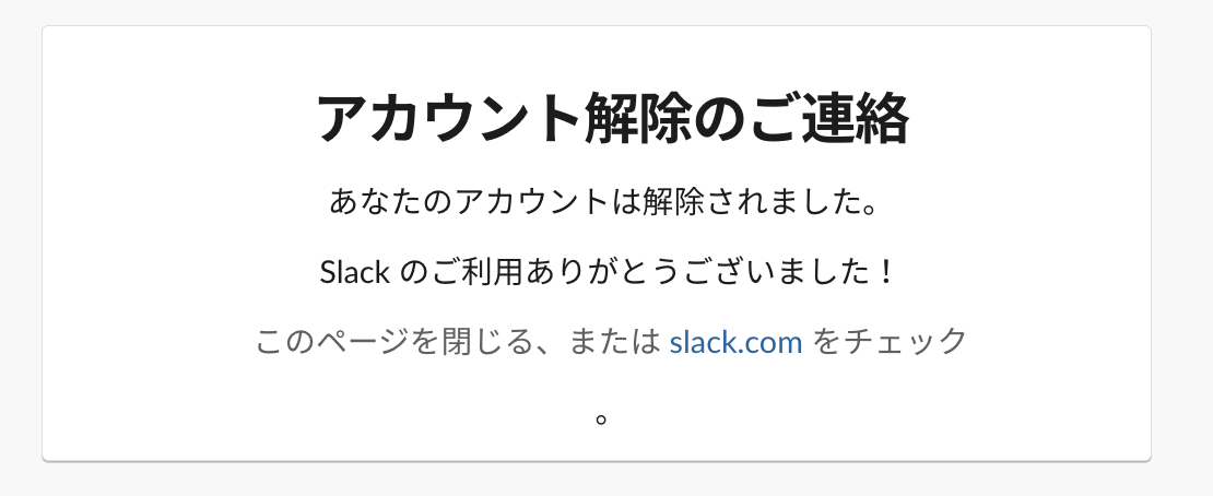 この変更は即座に適用されます。このワークスペースに再度加わりたい場合は、ワークスペースの管理者にアカウントを再び有効にしてもらう必要があります。アカウントが有効になると、あなたのメッセージとファイルは安全に保管されます。あなたが所属している他の Slack ワークスペースは、この変更によって影響を受けることはありません。