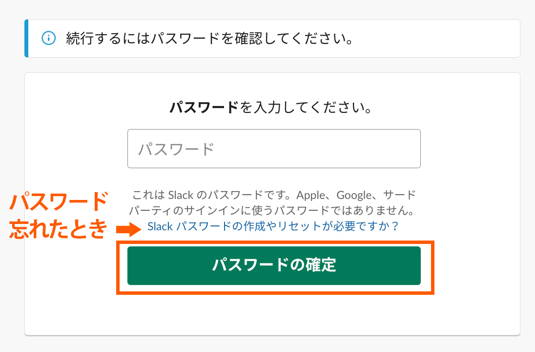 パスワードを忘れた場合は、リンク「Slackパスワードの作成やリセットが必要ですか?」をクリック。ワークスペースに登録されているメールアドレス宛にリセットメールが届くので、再設定しましょう。