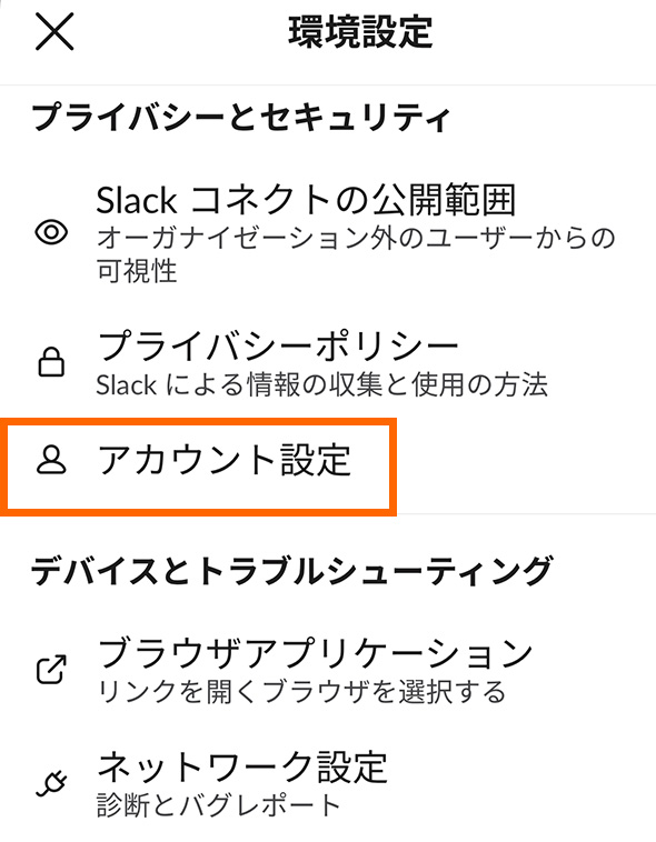 表示された環境設定メニューをスクロールして、「プライバシーとセキュリティ」項目内にある「アカウント設定」を選択します。